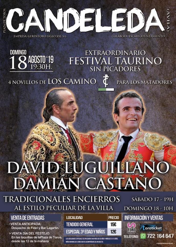 El domingo 19, a las 10:00 de la mañana se llevará a cabo la tradicional capea con cuatro vacas y un capeón y, al finalizar, la suelta de los novillos que se lidiarán en el Festival Taurino a las 19:30. Por la noche, a las 22:00 horas, tendrá lugar el concierto de Morcuende con la Orquesta y Coro del Mundo de Bobaliquia. en el patio del Colegio Público Almanzor. Más tarde, a las 23:30 actuación de El Pillo con Javi Rosi.
